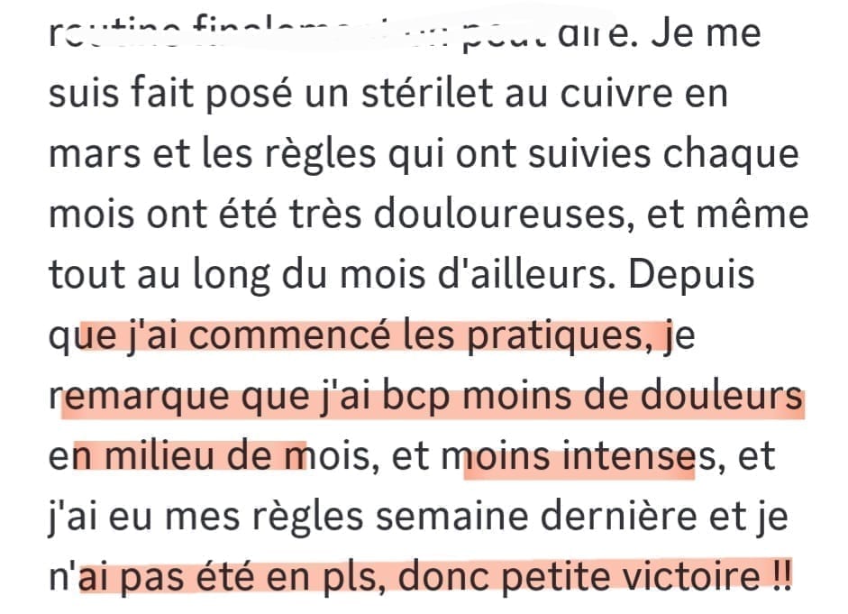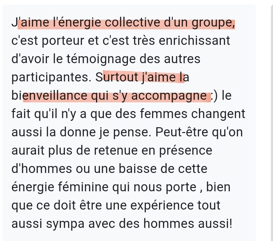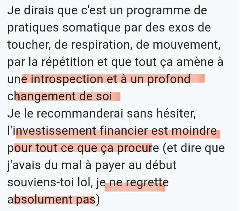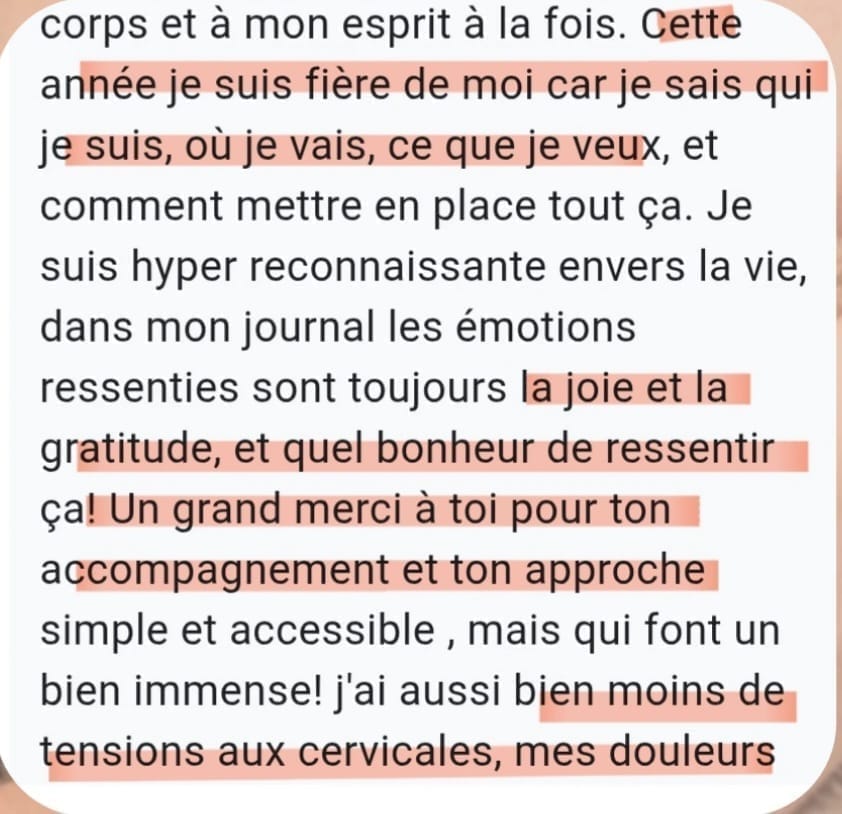 Mille merci pour ton accompagnement sur ses derniers mois, j'ai vraiment pu observer une évolution dans mon corps et dans ma facon d'appréhender de le monde. Depuis cet accompagnement, mes relations avec les autres (perso et pro) se sont améliorer mais SURTOUT ma relation avec moi même, je n'ai quasi plus de douleurs digestives et surtout je me sens plus calme au quotidien, moins dépasée par mes émotions :) Le plaisir de vivre sans se sentir bouleversée !